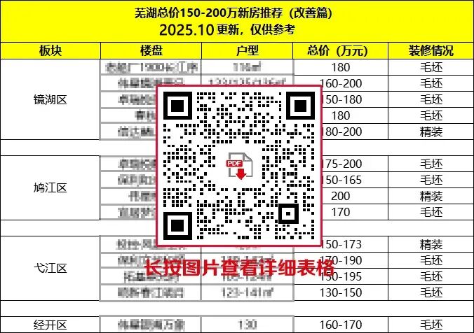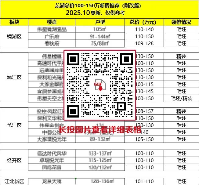 相较100万以内的预算,总价100-150万之间的新房可选择性相对减少一点,但是依旧是各个片区都能挑到,主要分别在鸠江区弋江区、经开区。另外这个预算的新房镜湖区也有三个楼盘可选了。