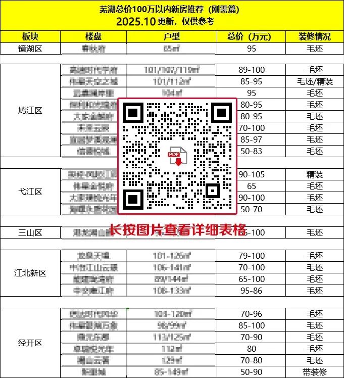 总预算100万以内在芜湖算得上是比较好房房源的,几乎各个片区都能找到相应的楼盘,但鸠江区弋江区、经开区和江北新区相对来说可选择性更多,因此,置业预算有限的朋友可以优先看看这几个区。