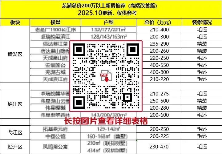总价在150-200万之间的新房,镜湖区有5个楼盘可选、鸠江区有四个在售楼盘可选、弋江区有四个楼盘可选。产品集合了大户型、洋房、复式等,同时各个项目周边的配套也更成熟一点。